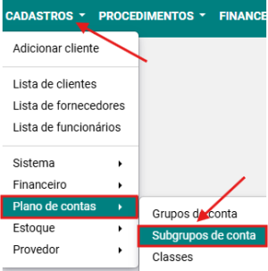 Passo 1: Selecione a opção CADASTROS → PLANO DE CONTAS → SUBGRUPOS DE CONTA