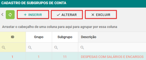 Passo 2: Clique no botão INSERIR para cadastrar um novo subgrupo de conta, ALTERAR para editar um subgrupo existente ou EXCLUIR para remover o subgrupo selecionado.