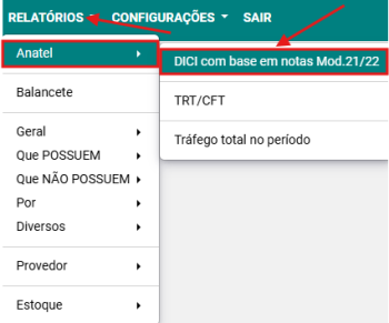 Passo 1: Acesse a opção RELATÓRIOS → ANATEL → DICI COM BASE EM NOTAS MOD.21/22