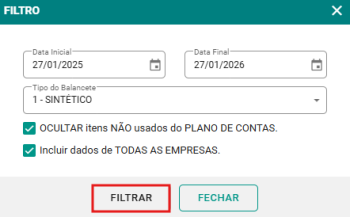 Passo 2: Informe o período desejado, selecione o tipo de balancete e marque as opções se necessário. Logo após, clique no botão FILTRAR para gerar o relatório.