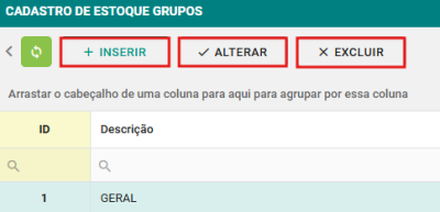 Passo 2: Clique no botão INSERIR para cadastrar um novo grupo de produto, ALTERAR para editar um grupo existente ou EXCLUIR para remover o grupo selecionado.