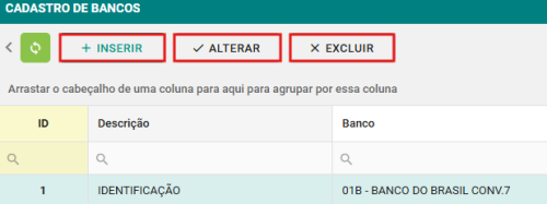 Passo 2: Clique no botão INSERIR para cadastrar uma nova conta bancária, ALTERAR para editar uma conta existente ou EXCLUIR para remover a conta selecionada.