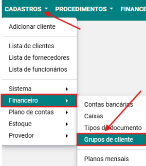 Passo 1: Selecione a opção CADASTROS → FINANCEIRO → GRUPOS DE CLIENTE