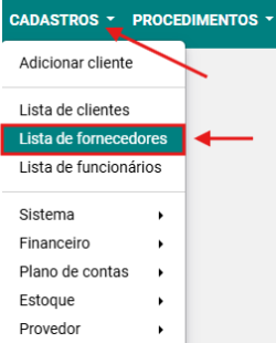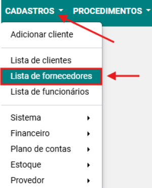 Passo 1: Selecionar a opção CADASTROS → LISTA DE FORNECEDORES