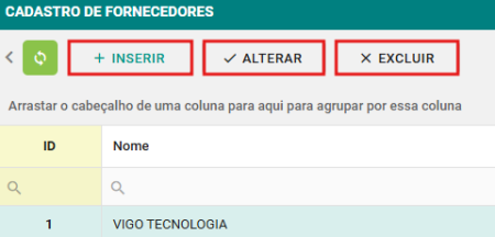 Passo 2: Clique no botão INSERIR para cadastrar um novo fornecedor, ALTERAR para editar um fornecedor existente ou EXCLUIR para remover o fornecedor selecionado.