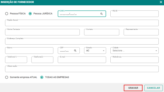 Passo 3: Preencha o formulário com as informações do fornecedor, como CNPJ, razão social, contato, etc. Logo após, clique no botão GRAVAR para salvar as informações.
