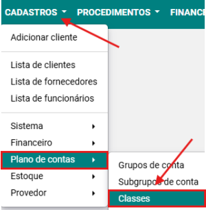 Passo 1: Selecione a opção CADASTROS → PLANO DE CONTAS → CLASSES