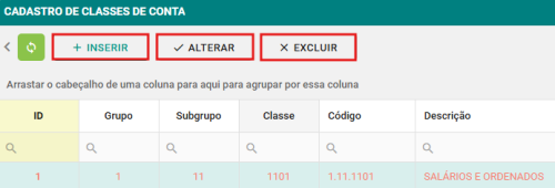 Passo 2: Clique no botão INSERIR para cadastrar uma nova classe de conta, ALTERAR para editar uma classe existente ou EXCLUIR para remover a classe selecionada.
