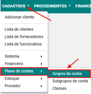 Passo 1: Selecione a opção CADASTROS → PLANO DE CONTAS → GRUPOS DE CONTA