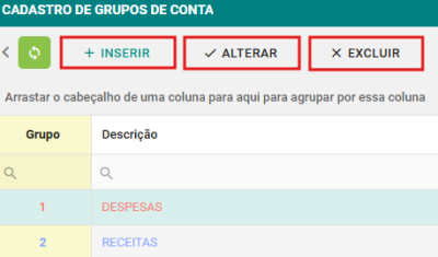 Passo 2: Clique no botão INSERIR para cadastrar um novo grupo de conta, ALTERAR para editar um grupo existente ou EXCLUIR para remover o grupo selecionado.