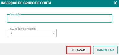 Passo 3: Preencha o formulário com as informações do grupo, como descrição e tipo (Débito/Crédito). Logo após, clique no botão GRAVAR para salvar as informações.