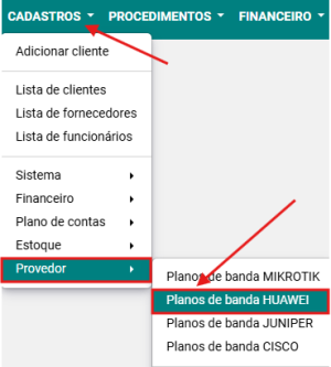 Passo 1: Selecionar a opção CADASTROS → PROVEDOR → PLANOS DE BANDA HUAWEI