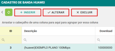 Passo 2: Clique no botão INSERIR para cadastrar um novo plano de banda Huawei, ALTERAR para editar um plano existente ou EXCLUIR para remover o plano selecionado.