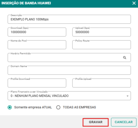 Passo 3: Preencha o formulário com as informações do plano de banda huawei, como descrição, plano financeiro a ser vinculado, etc. Logo após, clique no botão GRAVAR para salvar as informações.