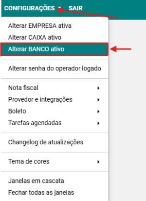 Passo 1: Acesse a opção CONFIGURAÇÕES → ALTERAR BANCO ATIVO