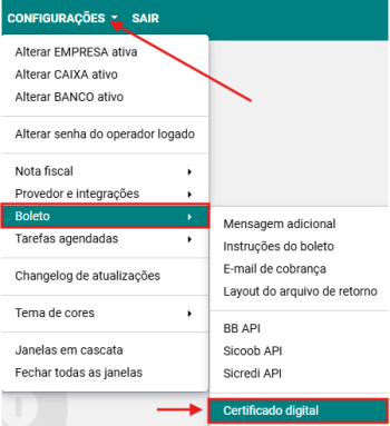 Passo 1: Selecione a opção CONFIGURAÇÕES → BOLETO → CERTIFICADO DIGITAL