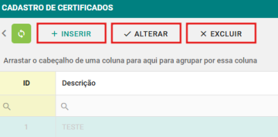 Passo 2: Clique no botão INSERIR para cadastrar um novo certificado digital, ALTERAR para editar um certificado existente ou EXCLUIR para remover o certificado selecionado.
