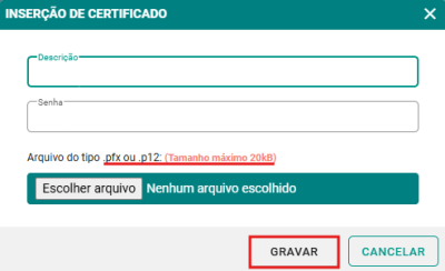 Passo 3: Preencha o formulário com as informações do certificado digital, como descrição, senha e insira o arquivo do certificado. Por fim, clique no botão GRAVAR para salvar a inserção.