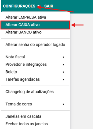 Passo 1: Acesse a opção CONFIGURAÇÕES → ALTERAR CAIXA ATIVO