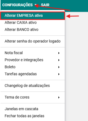 Passo 1: Acesse a opção CONFIGURAÇÕES → ALTERAR EMPRESA ATIVA