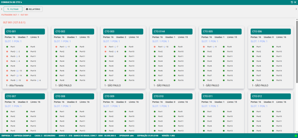 Passo 2: Visualize o Dashboard Fibra CTO, onde são apresentadas as CTOs com a quantidade de portas totais, usadas e livres, além do slot e PON vinculados, permitindo uma análise rápida da ocupação da fibra.