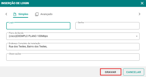 Passo 3: Na tela de cadastro, preencha as informações do login PPPoE, como Login, Senha, Plano de Banda, Endereço Completo e Observações. Em seguida, clique em GRAVAR para salvar as informações.