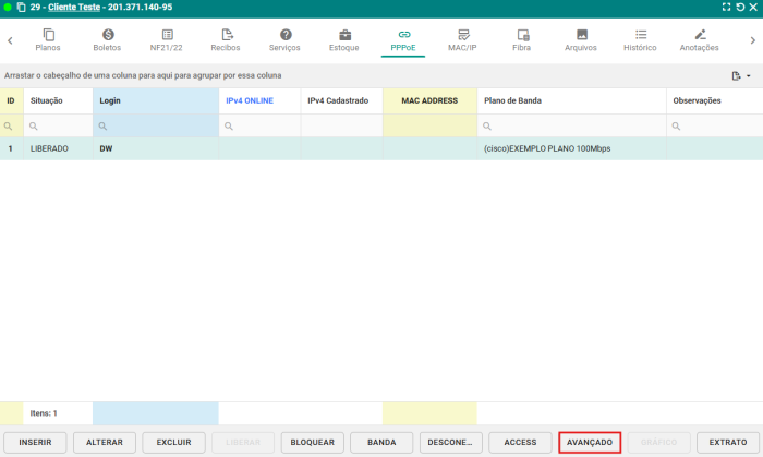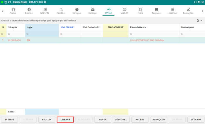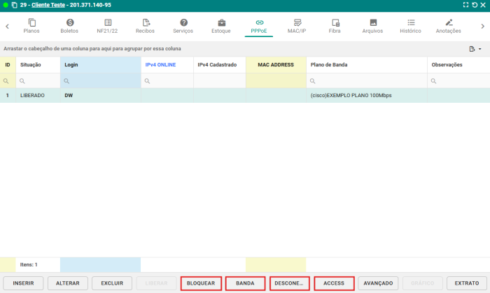 Passo 5: Se necessário, utilize BLOQUEAR para trancar o login PPPoE, BANDA para vincular ou alterar o plano de banda, DESCONECTAR para derrubar a sessão ativa ou ACESS para adicionar uma ACL ao login do cliente.