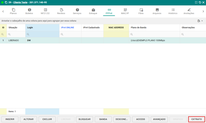 Passo 7: Para consultar informações detalhadas de conexão, selecione o login e clique em EXTRATO. Essa opção permite visualizar dados relacionados à utilização e registros da conexão PPPoE.