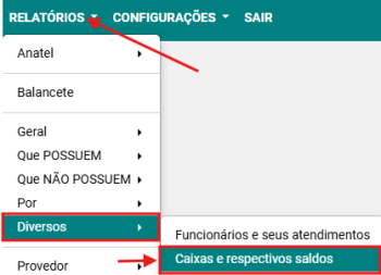 Passo 1: Acesse a opção RELATÓRIOS → DIVERSOS → CAIXAS E RESPECTIVOS SALDOS