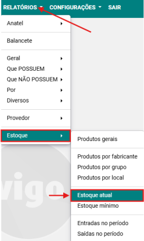Passo 1: Acesse a opção RELATÓRIOS → ESTOQUE → ESTOQUE ATUAL