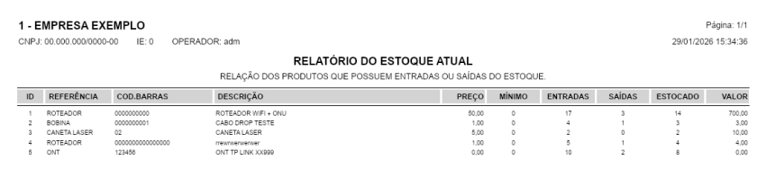 Passo 2: Visualize o relatório gerado, contendo a listagem de produtos com informações como código de barras, descrição, valores, saldo em estoque, entradas e saídas.
