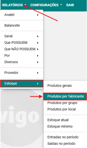 Passo 1: Acesse a opção RELATÓRIOS → ESTOQUE → PRODUTOS POR FABRICANTE