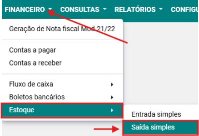 Passo 1: Acesse a opção FINANCEIRO → ESTOQUE → SAÍDA SIMPLES