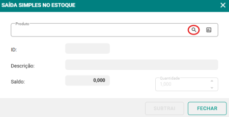 Passo 2: Na tela de Saída Simples, clique no ícone de pesquisa para localizar o produto que será retirado do estoque.
