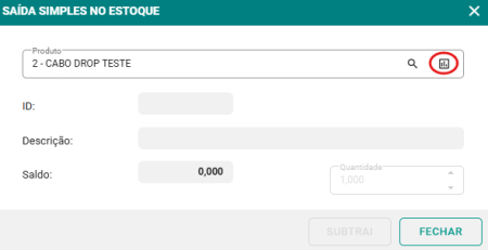 Passo 4: Com o produto selecionado, clique no ícone de dados para carregar as informações do produto, como descrição e saldo disponível.