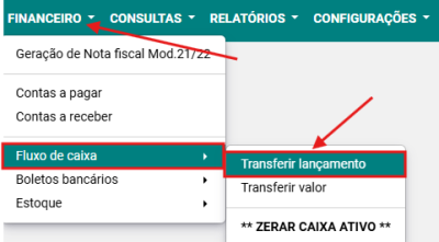Passo 1: Acesse a opção FINANCEIRO → FLUXO DE CAIXA → TRANSFERIR LANÇAMENTO