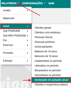 Passo 1: Acesse a opção RELATÓRIOS → GERAL → DECLARAÇÃO DE QUITAÇÃO ANUAL