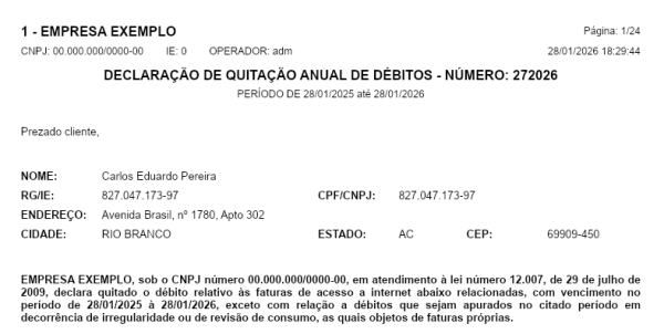 Passo 3: Visualize a declaração de quitação anual gerada, contendo a relação dos clientes quites no período selecionado.