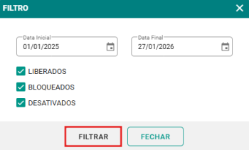Passo 2: Informe o período desejado e selecione os filtros disponíveis, conforme a necessidade. Em seguida, clique no botão FILTRAR para gerar o relatório.