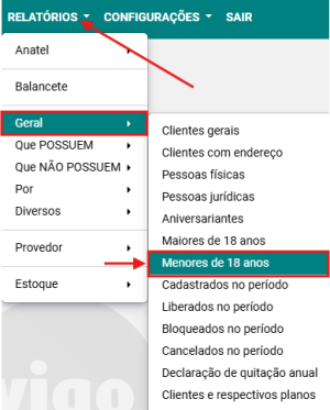 Passo 1: Acesse a opção RELATÓRIOS → GERAL → MENORES DE 18 ANOS