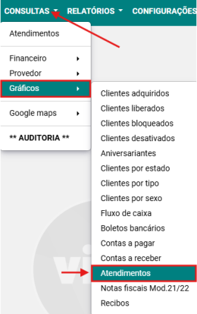 Passo 1: Acesse a opção CONSULTAS → GRÁFICOS → ATENDIMENTOS