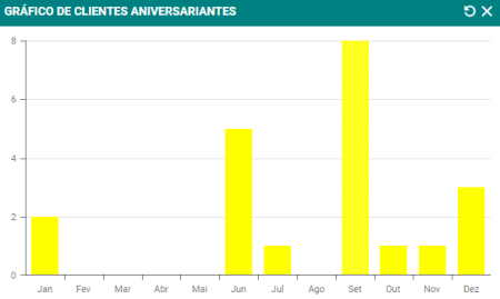 A funcionalidade Aniversariantes permite visualizar, por meio de gráfico, a quantidade de clientes que fazem aniversário de acordo com os meses, facilitando o acompanhamento dos aniversários ao longo do ano.