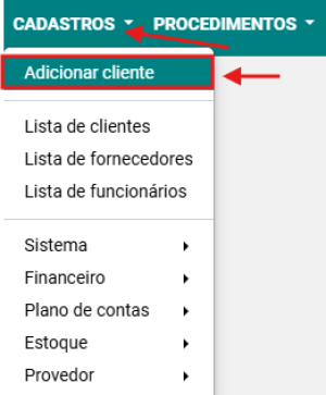 Passo 1: Selecionar a opção CADASTROS → ADICIONAR CLIENTES