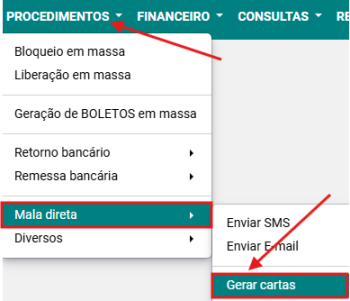 Passo 1: Selecionar a opção PROCEDIMENTOS → MALA DIRETA → GERAR CARTAS