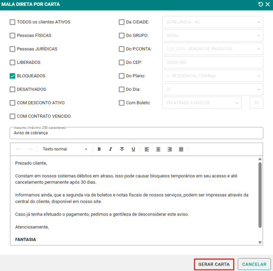 Passo 2: Selecione os filtros desejados, como clientes ativos, liberados, pessoa física, entre outros. Em seguida, informe o assunto e redija o conteúdo que será impresso. Logo após, clique no botão GERAR CARTA para realizar a impressão das mesmas.