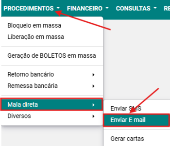 Passo 1: Selecionar a opção PROCEDIMENTOS → MALA DIRETA → ENVIAR E-MAIL