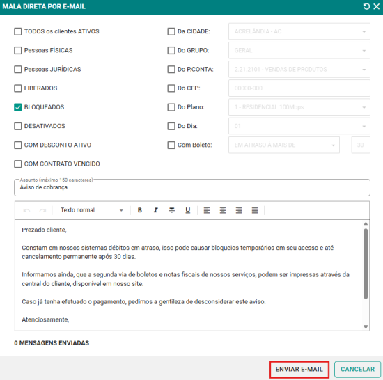 Passo 2: Selecione os filtros desejados, como clientes ativos, liberados, pessoa física, entre outros. Em seguida, informe o assunto do contato e, logo abaixo, redija o conteúdo da mensagem que será enviada. Logo após, clique no botão ENVIAR E-MAIL para encaminhar a mensagem aos destinatários.
