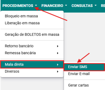 Passo 1: Selecionar a opção PROCEDIMENTOS → MALA DIRETA → ENVIAR SMS