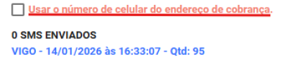 Atenção: A opção “Usar o número de celular do endereço de cobrança” permite que o sistema utilize o telefone informado no cadastro de cobrança como destino para o envio do SMS.