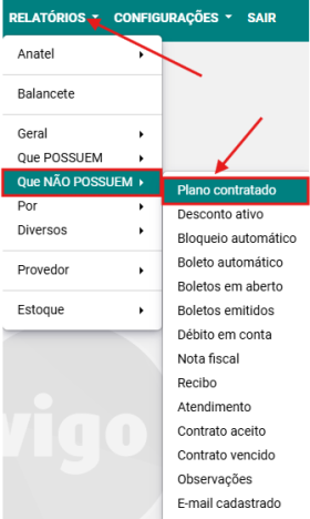 Passo 1: Acesse a opção RELATÓRIOS → QUE NÃO POSSUEM → PLANO CONTRATADO